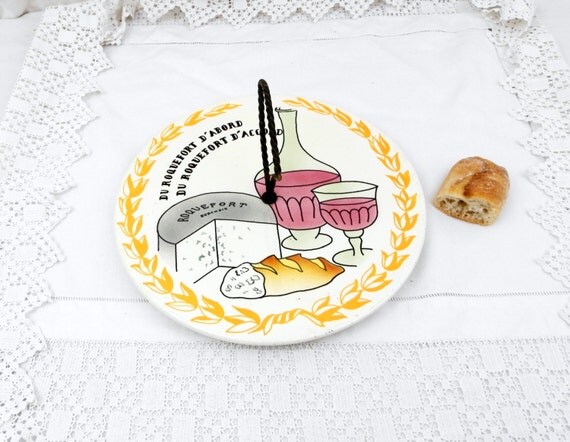 Vintage French Mid Century Ceramic Cheese Platter With Retro Illustration of a Carafe of Wine, Baguette and Roquefort Blue Cheese, Food by VintageDecorFrancais