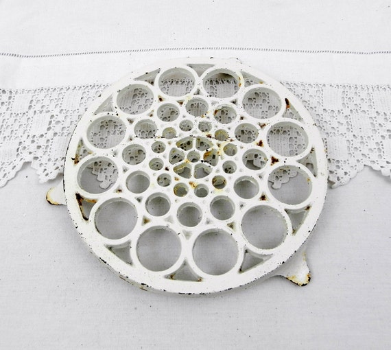 Large Round Antique French Cast Iron White Chippy Enamel Trivet, Hot Plate, Heat Mat, Cottage Kitchen, French Country, Kitchenware, Shabby by VintageDecorFrancais