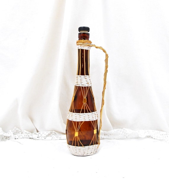 Vintage French 1960s Mid Century Amber Glass Bottle with Metal Wire and White Plastic Decoration, Retro Home Interior, Kitch 1970 Bottle by VintageDecorFrancais