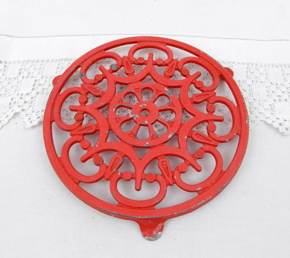 Round Antique French Cast Metal Red Trivet, Hot Plate, Heat Mat, Cottage, French Country Decor, Kitchenware, Kitchen, Plant Stand, Coaster by VintageDecorFrancais