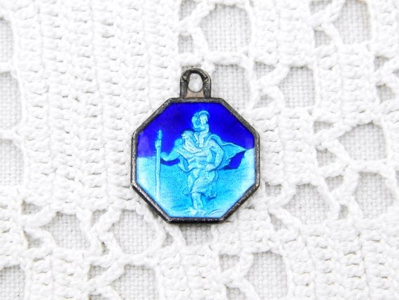Small Vintage French Coin Silver Religious Medal of Saint Christopher with Blue Enamel, St Christopher, Traveller, Catholic, Good Luck Charm by VintageDecorFrancais