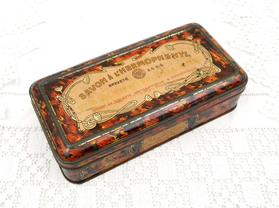 Antique French Lithographed Art Nouveau Antiseptique Soap Tin Box Gold Lettering, Apothecary, French Country Decor, Brocante, Retro, Decor by VintageDecorFrancais