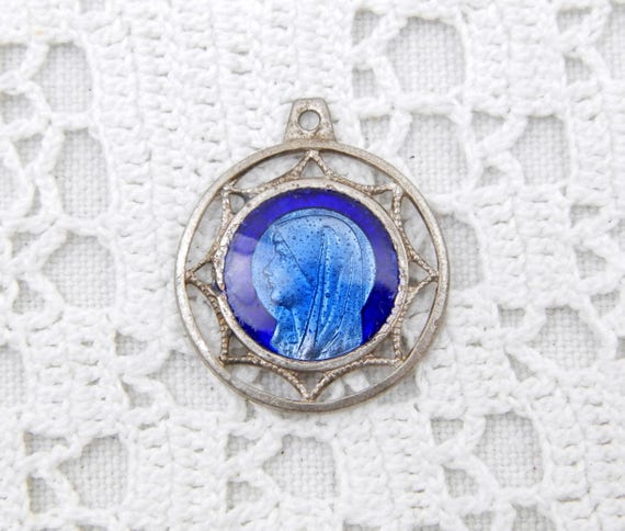 Small Vintage French Religious Silver Colored Metal and Blue Glass Enamel Medal Virgin Mary, Charm, Religion, Christian, Catholic, Madonna by VintageDecorFrancais