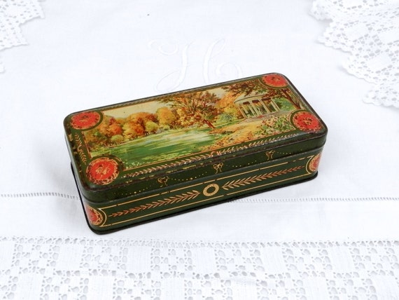 Antique French Rectangular Cookie Metal Tin with a Classical Watercolor Style illustration, Candy, Sweet Box, French Country Decor, Chateau by VintageDecorFrancais