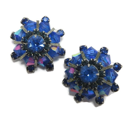 Weiss Royal Blue Rhinestone Earrings, Vintage AB Rhinestone Clip-on Earrings, Signed Weiss Jewelry by LeesVintageJewels
