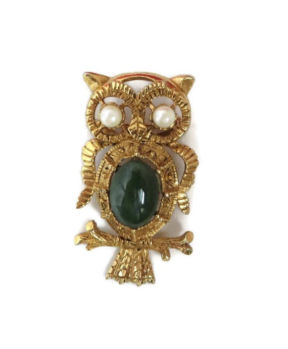Owl Pendant Brooch, Vintage Gold Tone Owl Brooch-Pendant, Jade Glass Brooch, Faux Pearl Eyed Owl Pin, Bird Pendant, Owl Jewelry by LeesVintageJewels