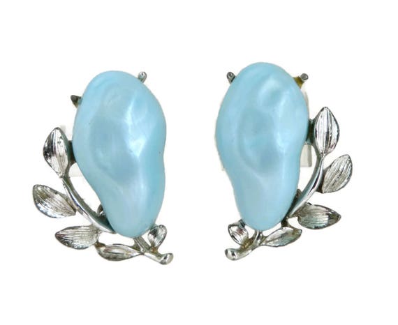 BSK Blue Lucite Earrings, Vintage Light Blue Silver Tone Leaf Clip-on Earrings, Kidney Shape Earrings by LeesVintageJewels