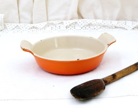 Small Vintage French Le Creuset from France Bright Orange and White Enameled Cast Iron 28 Oven Dish, Retro Kitchen Enamelware from France by VintageDecorFrancais