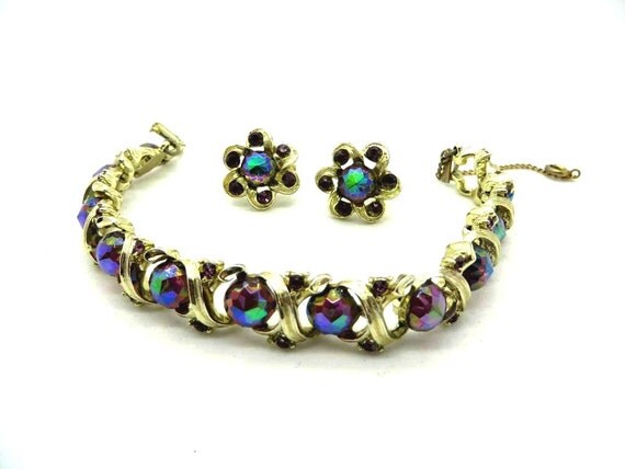 Vintage Watermelon Rhinestone Bracelet , Screw Back Earrings Set, Signed Longcraft Demi Parure by LeesVintageJewels