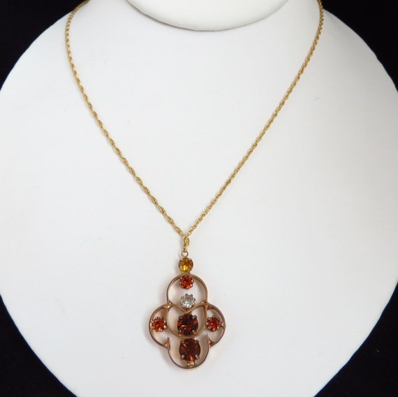 Vintage Orange Rhinestone Pendant, Gold Filled Chain Link Necklace, 24" Length by LeesVintageJewels