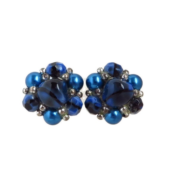 Trifari Blue Cluster Bead Earrings, Vintage Silver Tone Blue & Silver Bead Clip-ons by LeesVintageJewels