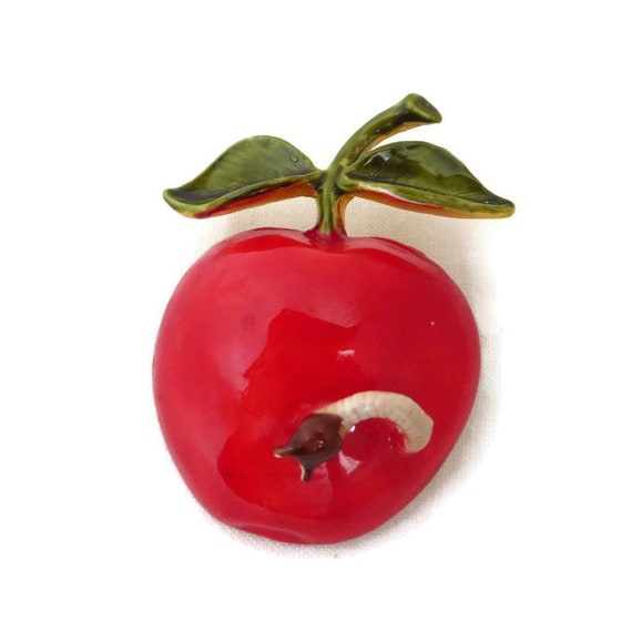 Red Apple Brooch, Vintage Apple Pin, Hattie Carnegie Vintage Jewelry, Red Fruit Brooch with Worm, Vintage Gold Tone Signed Designer Pin by LeesVintageJewels