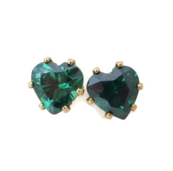 14K Gold Earrings, Emerald CZ Pierced Earrings, Vintage Heart Earrings, Pierced Studs, May Birthday, Gift for Her by LeesVintageJewels