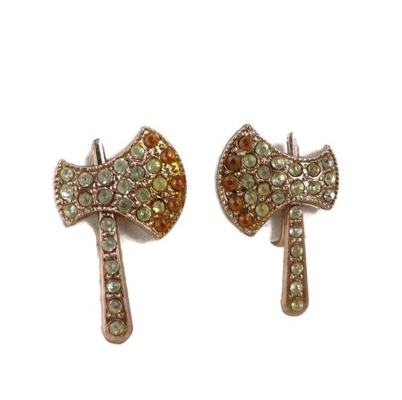 Vintage '50s Novelty Earrings, Copper Toned Rhinestone Tomahawk Screwback Earrings by LeesVintageJewels