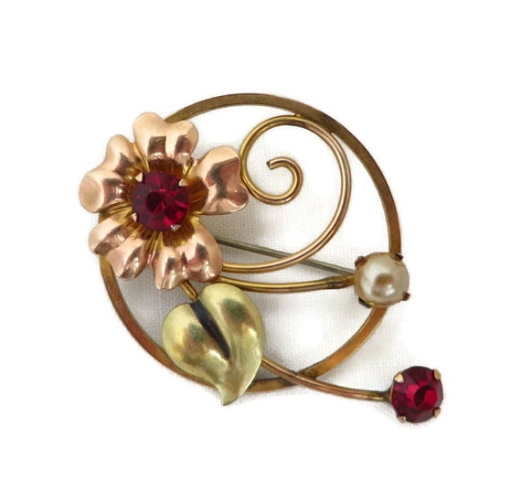 Circle Pin, Vintage Gold Filled Designer Brooch, BAL-RON 1/20 12K GF Circle Pin, Red Rhinestone Flower Brooch, Gift for Her by LeesVintageJewels
