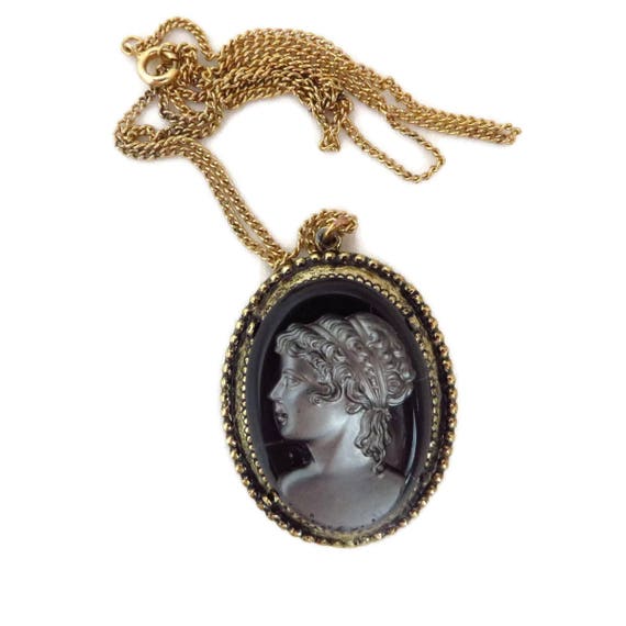 Vintage Cameo Necklace | Black Gray Glass Pendant | Gold Tone Chain Necklace | Flawed Cameo by LeesVintageJewels