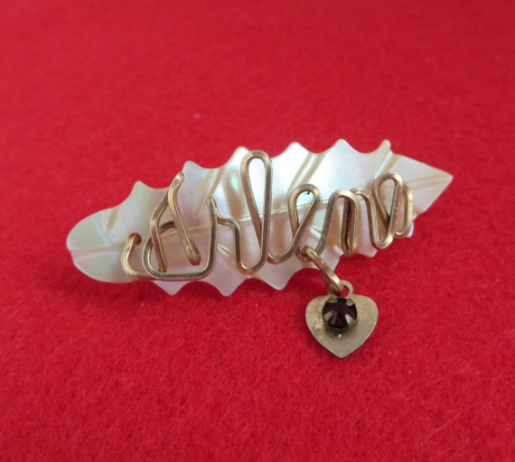 Mother of Pearl Name Brooch, Vintage Carved Shell Brooch, Gold Wire Script "Arlene", Dangling Heart Red Bead Brooch by LeesVintageJewels