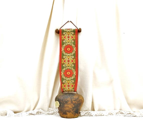 Vintage Decorative Metal Cow Bell From the Alps with Woven Folk Pattern Fabric Braid, Original Alpenshelle Swiss Mountain Cowbell by VintageDecorFrancais