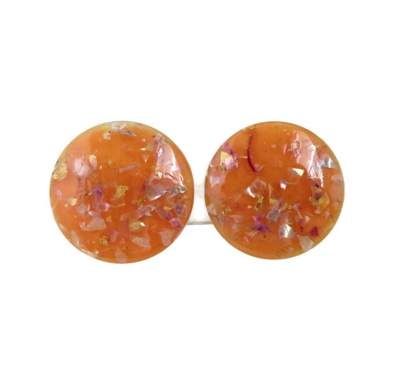 Orange Lucite Earrings, Vintage Confetti Earrings, Mid Century Button Clip on Earrings, Party Jewelry by LeesVintageJewels