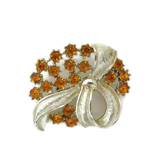 Vintage Orange Rhinestone Flower Brooch, Goldtone Bow Pin, 1960s Jewelry, Mid Century Brooch, Gift For Her by LeesVintageJewels