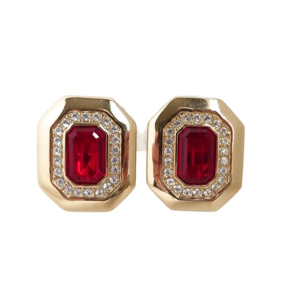 Vintage S.A.L. Swarovski Crystal Earrings, Ruby Red & Clear Rhinestone Earrings, Gold Tone Clip-on 1970s Jewelry by LeesVintageJewels