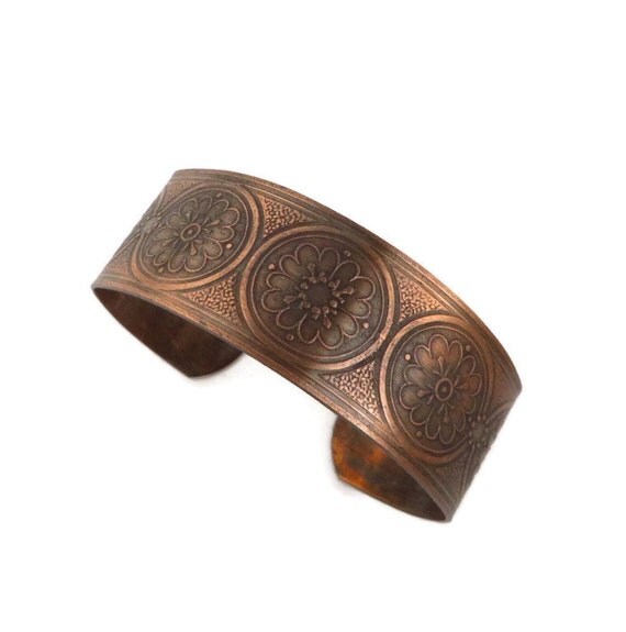 Vintage Solid Copper Cuff, 1970s Flower Design Bracelet by LeesVintageJewels