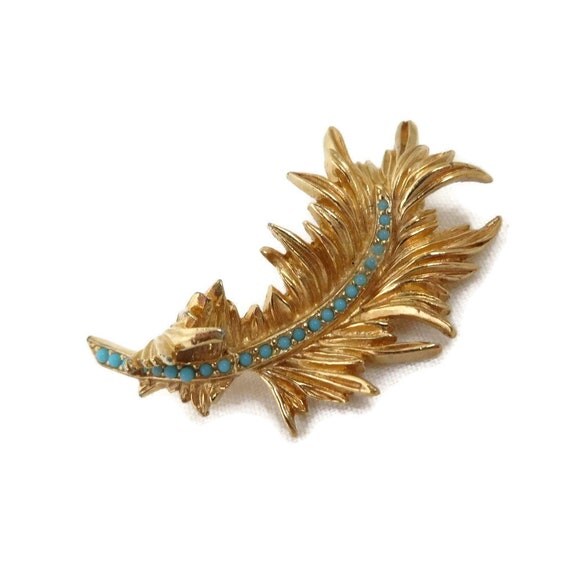 Ciner Gold Tone Leaf Brooch, Vintage Turquoise Beaded Curly Leaf Pin, Signed Designer Gift for Her by LeesVintageJewels