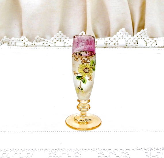 Small Antique Hand Painted Boheme Glass Posy Vase, Tiny French Art Nouveau Flower Bouquet Stem Foot Glass Vase with Painte Floral Pattern by VintageDecorFrancais