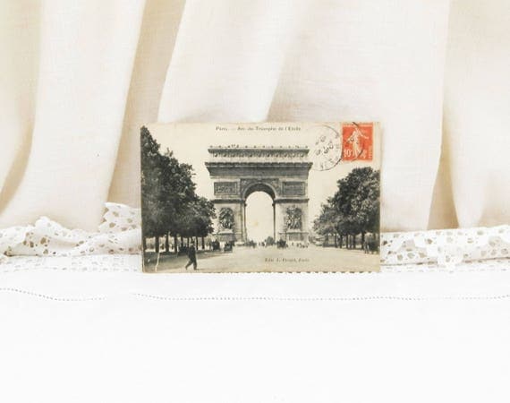 Antique French Postcard Arc de Triomphe the Top of the Champs Elysees in Paris with Horse Carriages and Early Automobile Car Posted in 1910 by VintageDecorFrancais