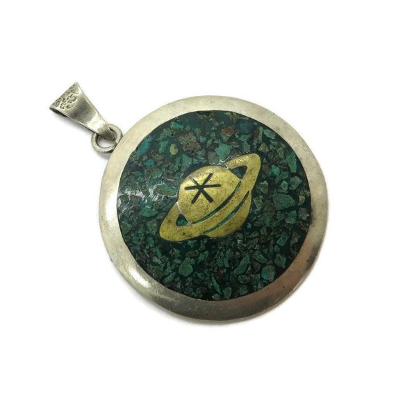 Mexico Vintage Antique Finish Crushed Malachite Saturn Pendant by LeesVintageJewels