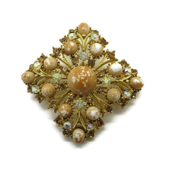 Weiss Orange and White Bead Rhinestone Studded Gold Tone Vintage Brooch by LeesVintageJewels