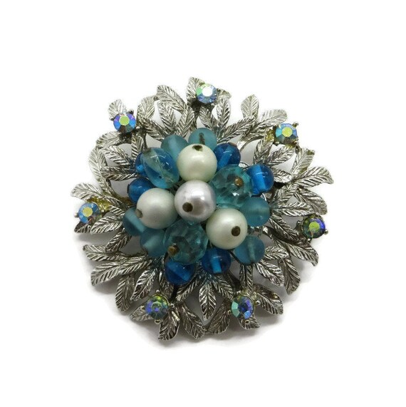 Coro Silver Tone Blue and White Bead AB Rhinestone Flower Brooch Pin by LeesVintageJewels
