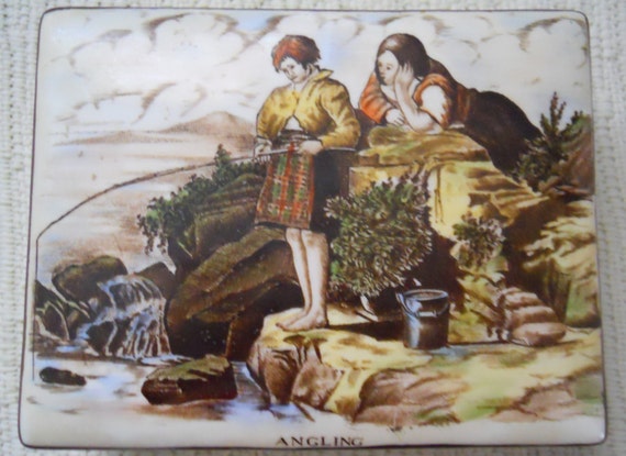 Vintage Gray's Pottery Trinket Box, Hand-Painted Box with Fishing Scene by LeesVintageJewels