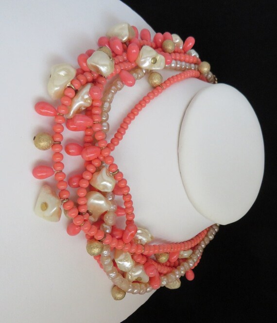 Vintage Multistrand Necklace - Faux Coral & Pearl Beaded Choker, Gift Idea, Gift Boxed by LeesVintageJewels