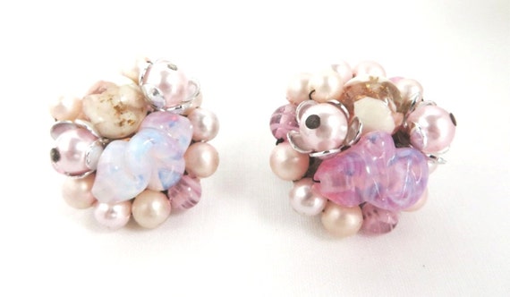 Vintage Japan Pink Cluster Earrings, Faux Pearl Bead & Art Glass Clip-ons by LeesVintageJewels