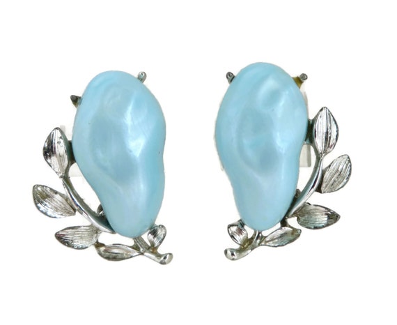 BSK Blue and Silver Tone Leaf Earrings, Vintage Kidney Shape Clip-on Earrings by LeesVintageJewels