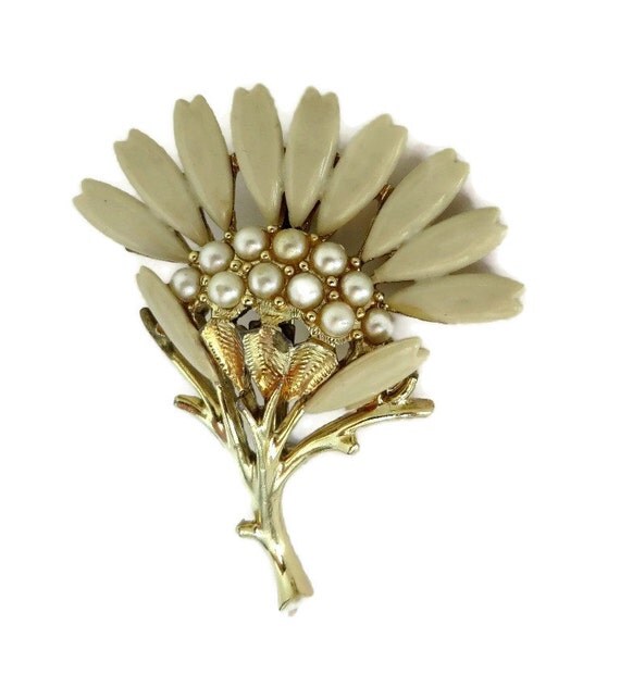 Cream Thermoset & Faux Pearl Brooch, Vintage 1950's Gold Tone Flower Pin by LeesVintageJewels