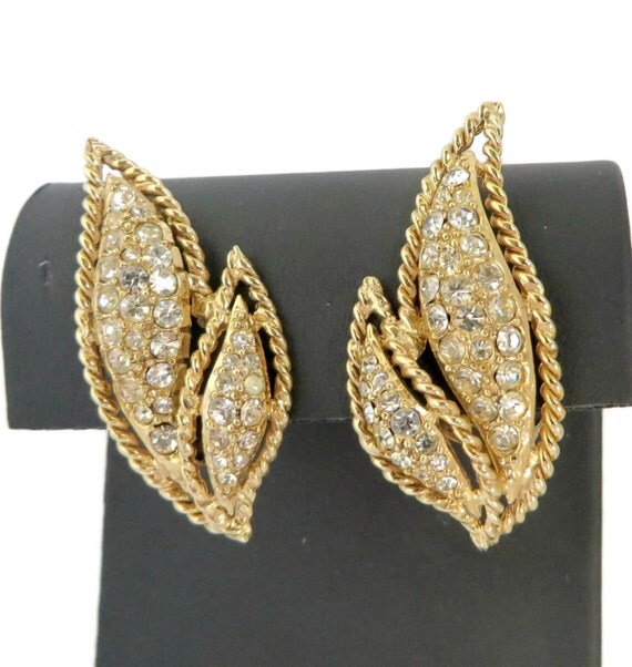 Hattie Carnegie Vintage Rhinestone Earrings, Large Braided Leaf Clip-ons, Bridal Jewelry by LeesVintageJewels