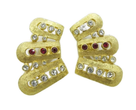 Hattie Carnegie Rhinestone Fan Earrings, Vintage Gold Tone Red White Rhinestone Clip-on Earrings by LeesVintageJewels