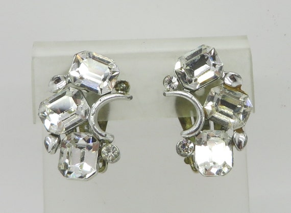 Lisner Clear Rhinestone Curved Earrings, Vintage Silver Tone Clip-on Earrings by LeesVintageJewels