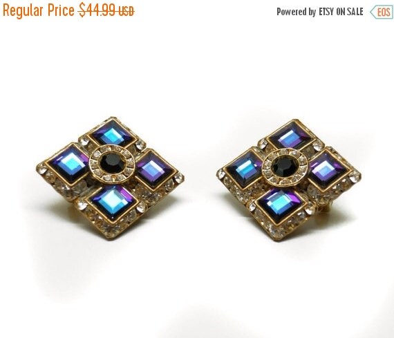 Storewide 25% Off SALE Vintage Gold Tone Iridescent Center Stone Designer French Post Rosette Earrings Featuring Circular Diamond Rhinestone by ClevelandFinds