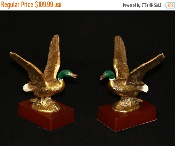 Storewide 25% Off SALE Vintage Stately Cast Brass Philadelphia Company Flying Green Headed Mallard Bookend Set Featuring Wooden Pedestal Bas by ClevelandFinds