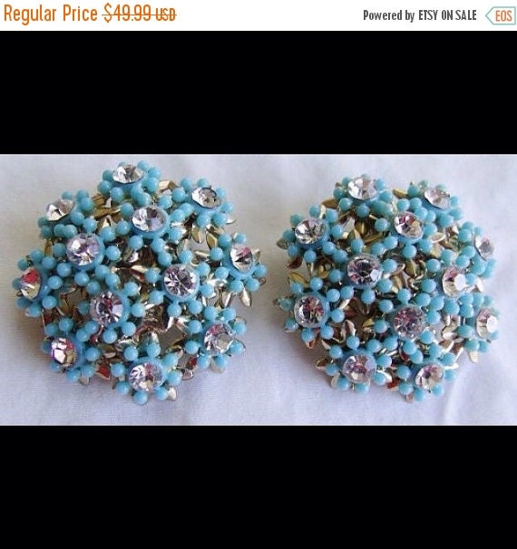 Storewide 25% Off SALE Vintage Baby Blue Beaded Cluster Style Designer Clip Earrings Featuring Subtle Rhinestone Accented Embellishments by ClevelandFinds