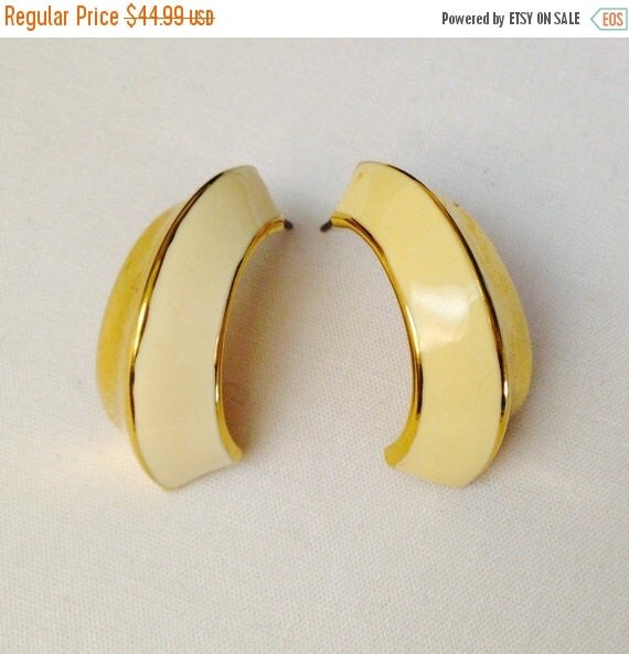 Storewide 25% Off SALE Vintage Gold Tone Monet Designer Signed Pierced Earrings Featuring Elegant Cream Enamel Accented Design by ClevelandFinds