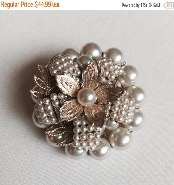 Storewide 25% Off SALE Antique Matted Gold Tone Faux Pearl Designer Floral Fur Clip Featuring Elegant 1930's Design by ClevelandFinds