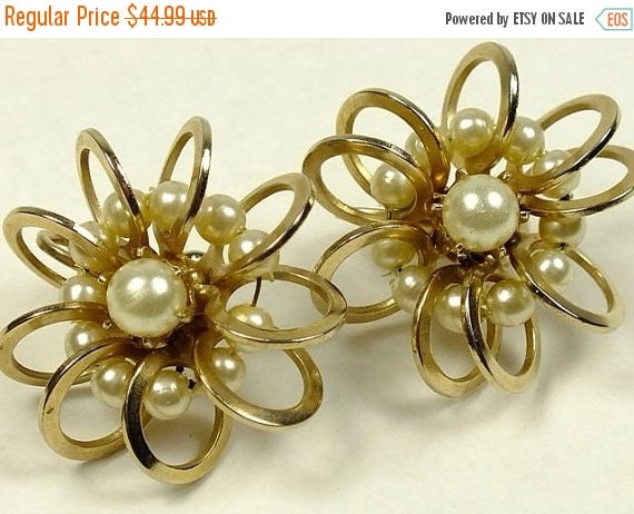 Storewide 25% Off SALE Beautiful Vintage Floral Inspired Multi Dimensional Pearl Earrings Featuring Circular Open Gold Tone Wire Clip-On Des by ClevelandFinds