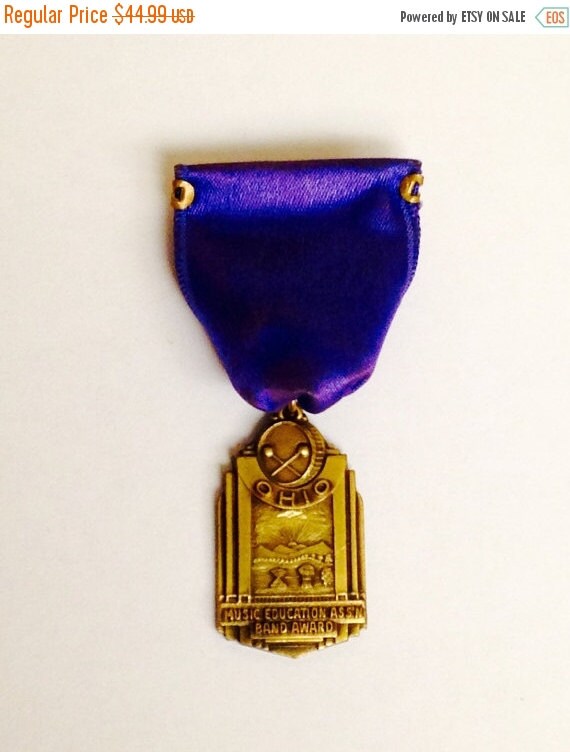 Storewide 25% Off SALE Vintage Bronze Tone Ohio's Music Educational Association Band Award Pin Featuring Purple Silk Style Banner by ClevelandFinds