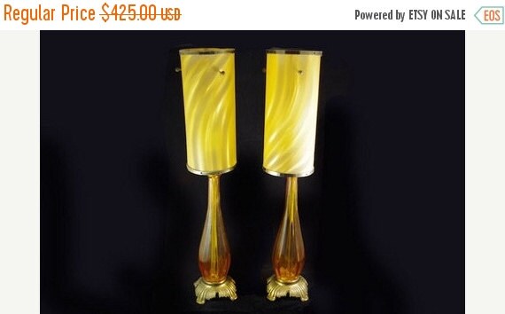 Storewide 25% Off SALE Beautiful Mid-Century Vintage Designer Cylinder Table Lamps Featuring Classic Brown Glass Base and Yellow Plastic Lam by ClevelandFinds