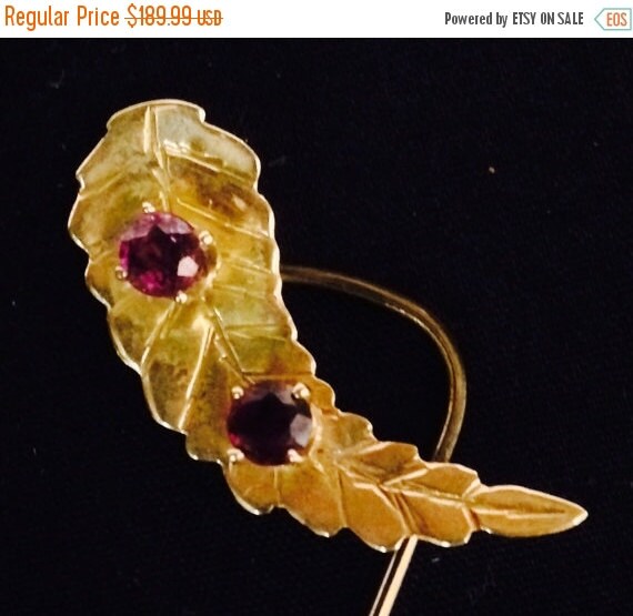 Storewide 25% Off SALE Vintage Solid 14k Gold Victorian Style Stick Pin With Amethyst Embellishments Featuring Textured Curved Leaf Design by ClevelandFinds