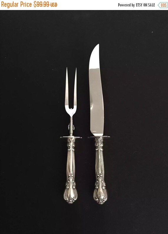 Storewide 25% Off SALE Vintage Buckingham 1910 Gorham Sterling Silver French Blade Carving Knife & Meat Fork Set Featuring Timeless Inscribe by ClevelandFinds